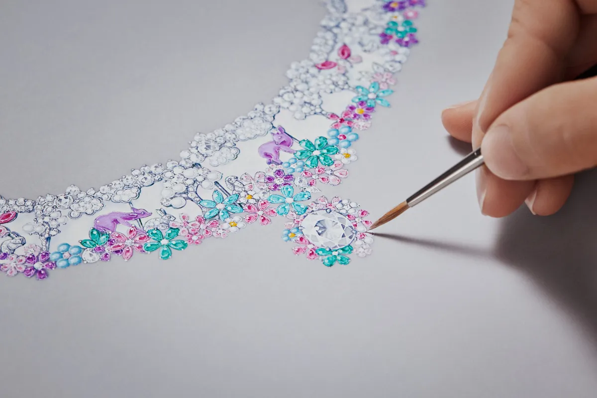 この作品群は、ディオールの創設者であるクリスチャン・ディオールが愛してやまなかった自然からのインスピレーションを受けています。特に、オパールやルビー、サファイア、ツァボライトなどの宝石は、まるで自然の中で輝くかのようにこのコレクションに息を吹き込んでいます。なるべく選ばれた素材は、それぞれに独自の物語を持っており、ディオールの美学と職人の技術がいかに深く結びついているかを感じさせます。
