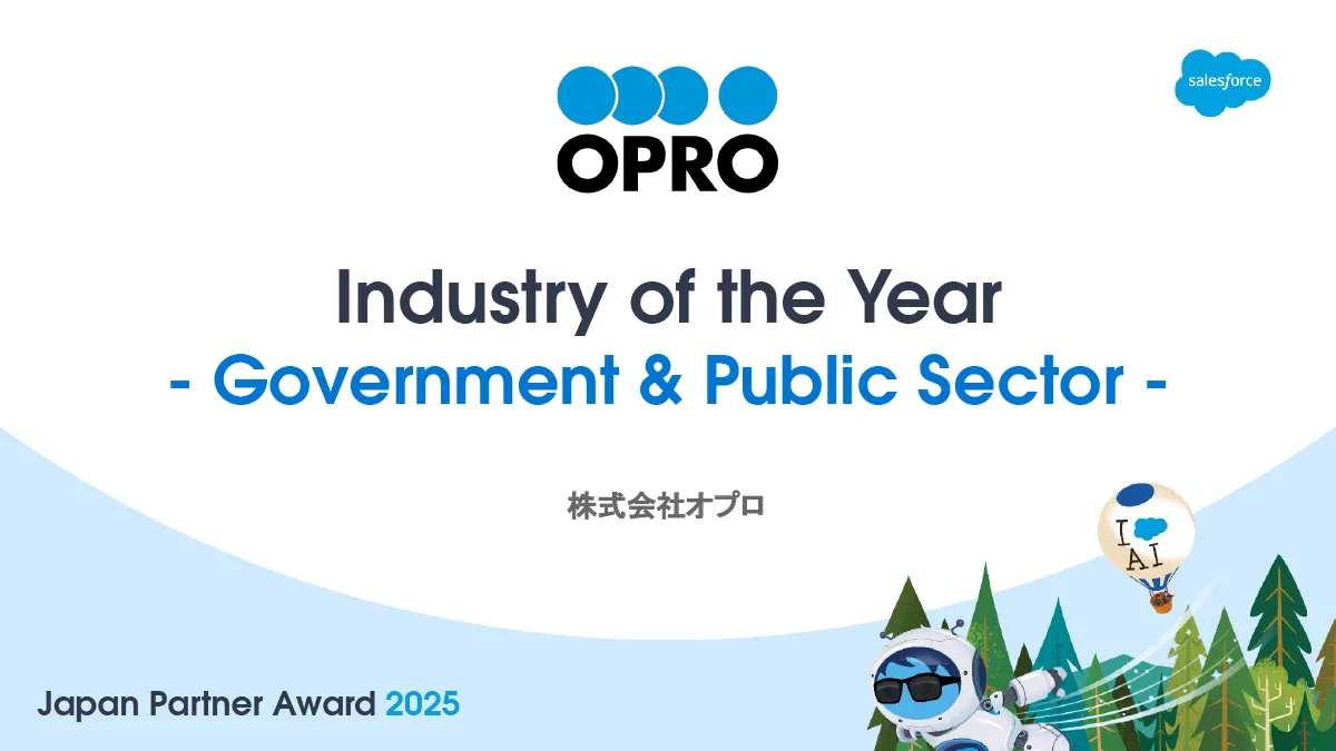 東京都中央区に本社を構える株式会社オプロ(代表取締役社長:里見一典)は、このたびSalesforce Japan Partner Award 2025において、業界別に設けられた「Industry of the Year -Government & Public Sector-」の受賞を果たしました。この栄誉は、オプロが公共機関向けの業務プロセス支援において特に卓越した成果を収めたことを評価されたものです。