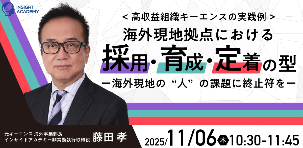 インサイトアカデミー株式会社は、海外現地拠点における人材採用、育成、定着に焦点を当てた無料セミナーを開催します。このセミナーでは、成功事例として知られるキーエンスの元海外事業部長、藤田孝氏が登壇し、効果的な人材マネジメントのノウハウを伝授します。