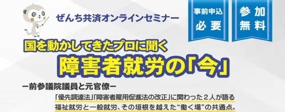 2026年2月14日(土)、前参議院議員の山本博司氏と元福岡労働局長の小野寺徳子氏をお迎えし、障害者就労についてのオンラインセミナーを開催します。このセミナーは、障害者向けの保険を取り扱う専門保険会社、ぜんち共済株式会社の主催です。