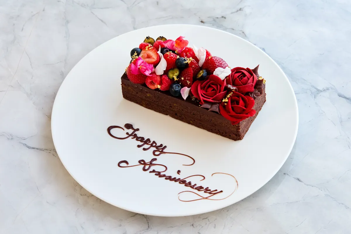 さらに、宿泊を彩る特別なアメニティーも嬉しいポイントです。客室では、シャンパーニュと特製アニバーサリーケーキが用意され、館内のレストランでのディナーでもお楽しみいただけます。お食事の最後には、メッセージ付きのホールケーキでお祝いムードを一層盛り上げます。