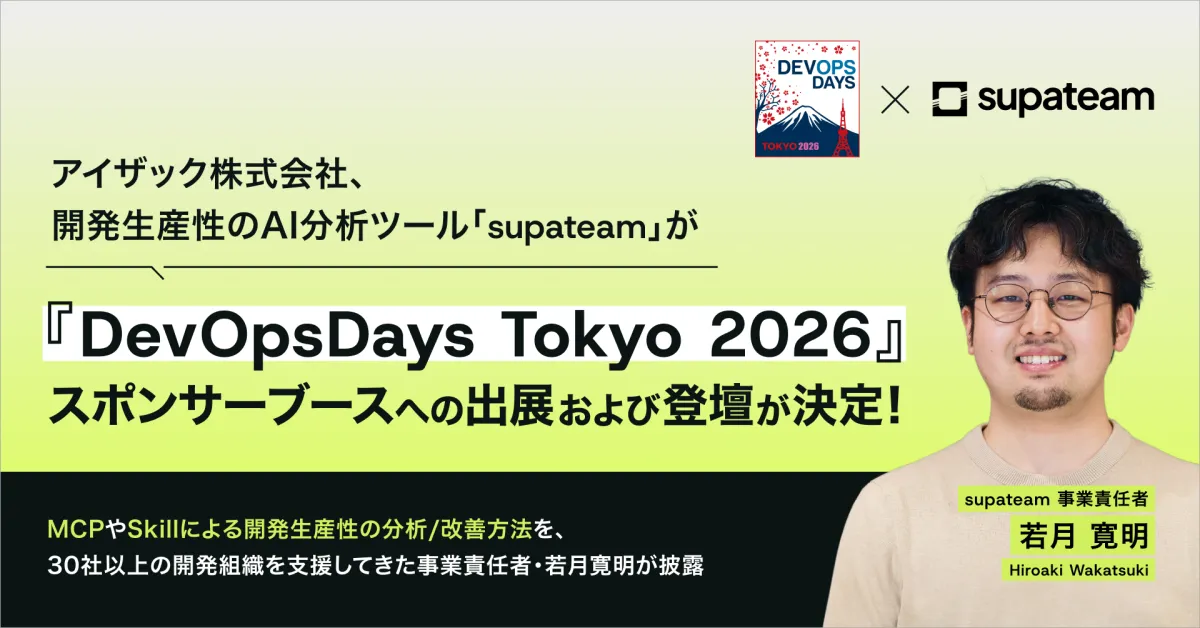 アイザック株式会社は、4月14日から16日に開催される『DevOpsDays Tokyo 2026』にて、開発生産性支援サービス「supateam」をスポンサーブースに出展することが決まりました。また、初日の14日には、「supateam」の事業責任者である若月寛明が特別講演を行います。