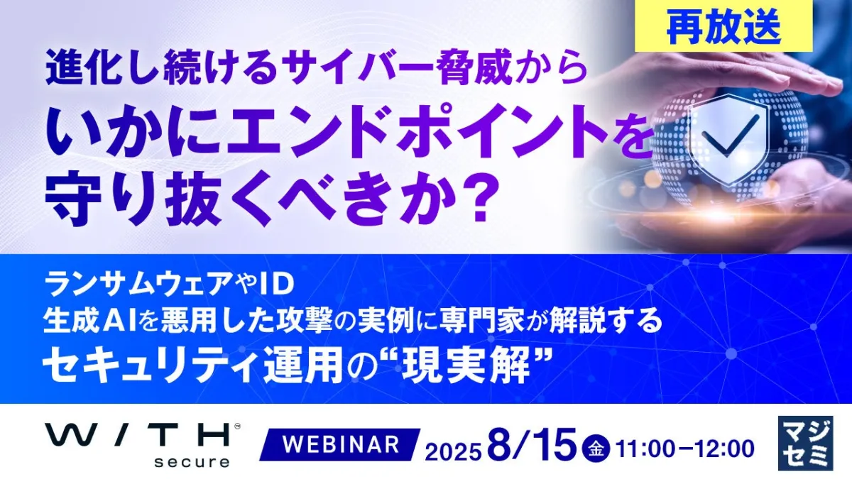 2025年7月22日に行われたウェビナー「進化し続けるサイバー脅威から、いかにエンドポイントを守り抜くべきか?」が、参加者の強い要望に応えて再放送されることになりました。このウェビナーは、エンドユーザー企業を対象としており、ITベンダーやSI企業の方々の参加は事前に制限される場合がありますので、その点もご留意ください。