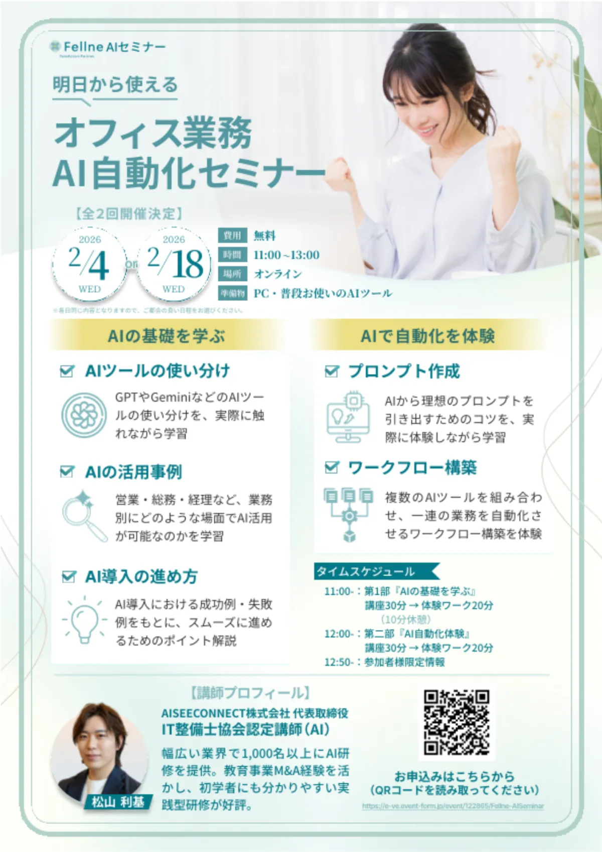 AISEE CONNECT株式会社は、株式会社オカモトヤが運営する女性活躍推進事業“Fellne”と共に、2026年2月4日と18日に『オフィス業務AI自動化セミナー』を開催します。本イベントは初心者向けにデザインされており、AIを使った業務効率化の基礎から詳しく学べるチャンスです。