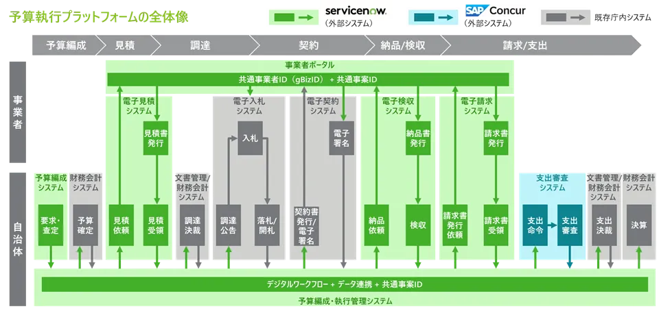 新しいプラットフォームでは、共通事案IDを中心に予算の編成から執行までの一連のプロセスが統合されます。これにより、各システムの情報が連携し、予算執行の業務がスムーズに行えるようになります。さらに、事業者はポータル経由で電子契約や電子請求書の提出が可能となるため、業務の効率が大幅に向上します。