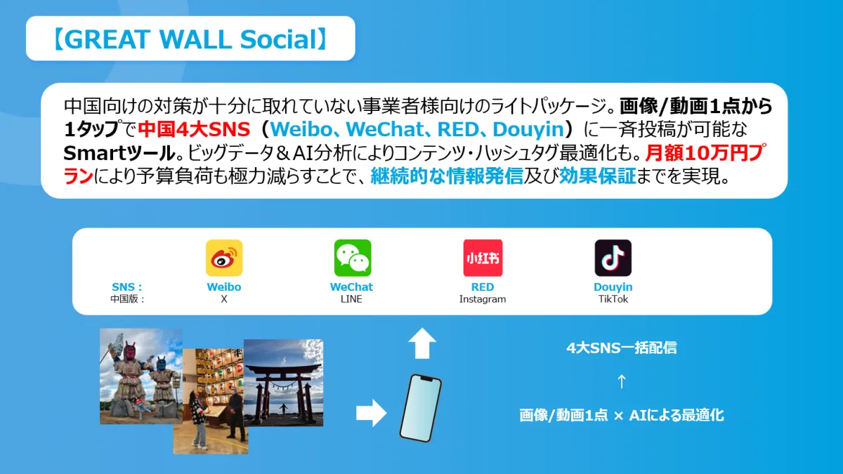 このたび、KENTOSHI株式会社より新たに発表された「GREAT WALL Social」は、中国の主要SNSであるWeibo、WeChat、RED、Douyinの運営を、一括して月額10万円で提供するサービスです。このプラットフォームは、ビッグデータとAIを駆使してコンテンツ投稿を極めて効率的に行い、集客とエンゲージメント双方の効果を保証します。