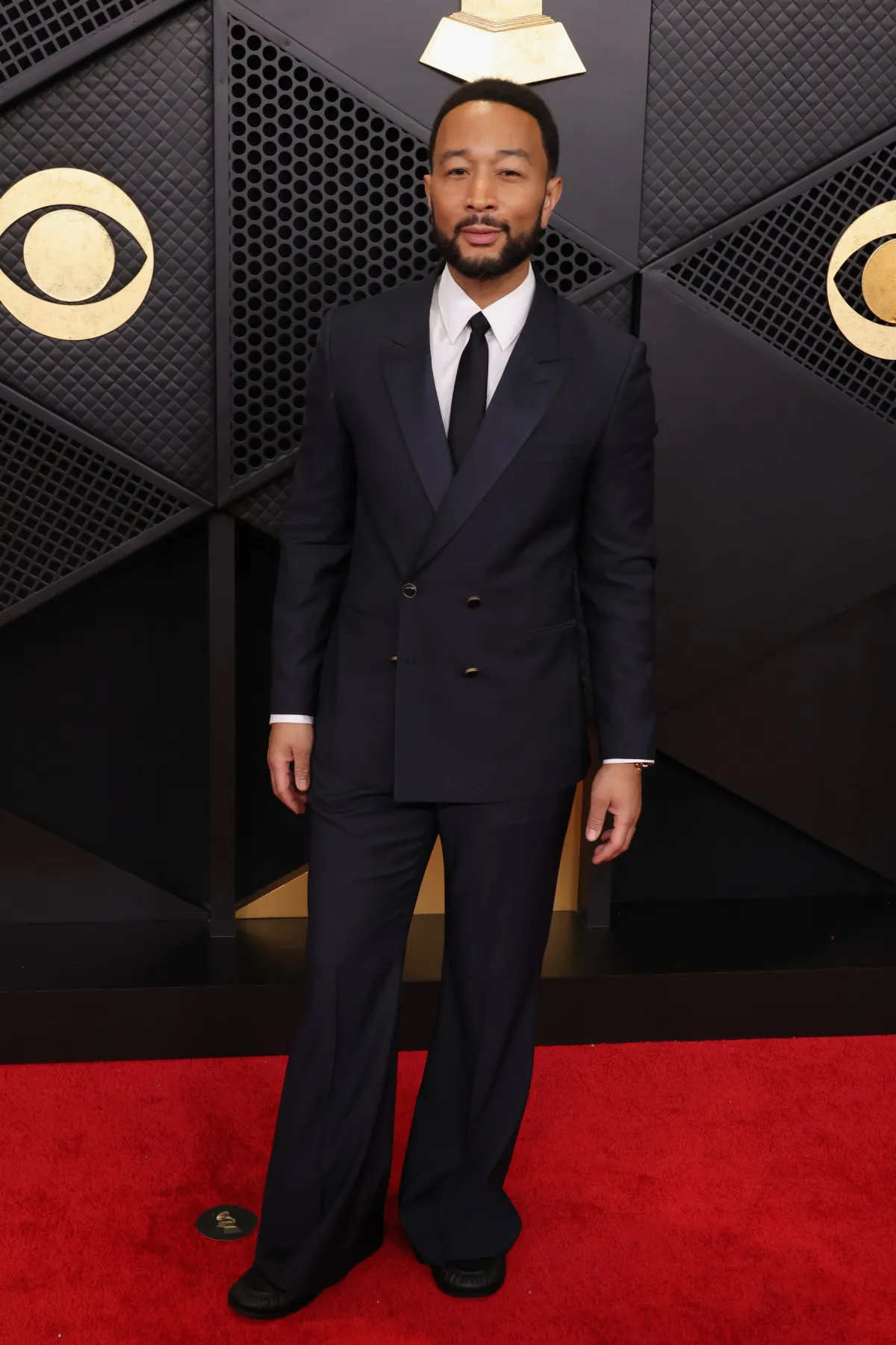 ジョン・レジェンドがグラミー賞のレッドカーペットに姿を現した瞬間、観衆はそのスタイリッシュな装いに息を飲みました。彼は、ネイビーブルーのダブルブレストタキシードジャケットにネイビーのフレアパンツを合わせ、クラシックながらもトレンド感のあるコーディネートを完成させました。白いシャツとブラックのサテンタイが、全体のルックを引き締め、ジャズローファーがその洗練された印象を一層高めています。このスタイルは、彼の音楽的才能と同様に、上品さと創造力が融合したものでした。
