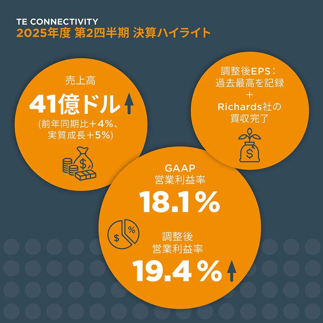 2025年度第2四半期のGAAPベースの1株当たりの利益(EPS)は0.04ドルという結果だったが、これは一時的な非現金税負担が影響した結果である。一方、調整後のEPSは2.10ドルで、前年同期比約13%の増加を示し、過去最高を記録した。この決算は、TE Connectivityの業績が安定し、成長するビジョンを実現していることを示している。
