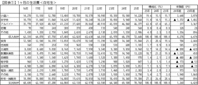 調査によると、自宅生の月収は72,648円で4,278円増加し、一方で支出は70,760円で1,260円の増加がありました。収入は少しずつ増えているものの、彼らの支出の大部分が食費へと回っている現状が浮き彫りになりました。特に食費の増加は、物価上昇の影響を如実に反映しています。