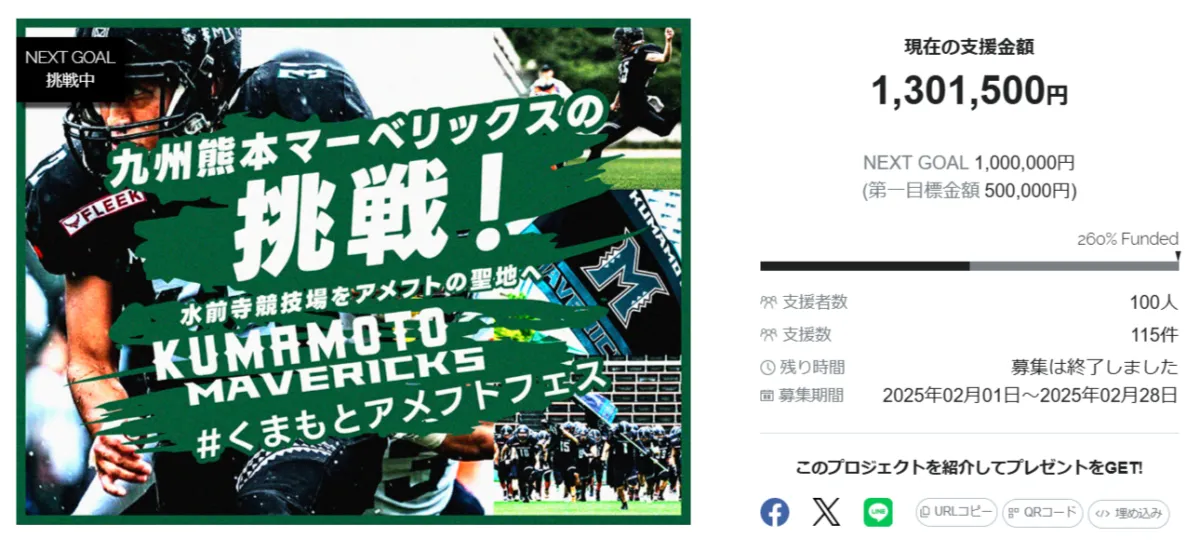 九州熊本マーベリックス、熊本県を拠点とするアメリカンフットボールチームが行った画期的なクラウドファンディングプロジェクト「九州熊本マーベリックスの挑戦!~水前寺競技場をアメフトの聖地へ~」が成功裏に終了しました。このプロジェクトは、総支援金額1,301,500円を達成し、1st Goalの500,000円、さらに2nd Goalの1,000,000円も上回る結果となりました。