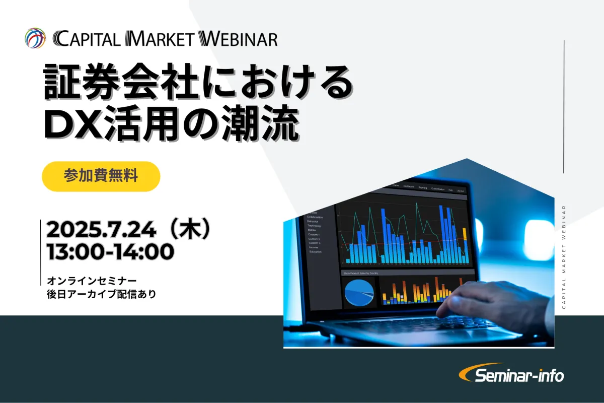 株式会社セミナーインフォは、2025年7月24日(木)に「証券会社におけるDX活用の潮流」をテーマにしたオンラインセミナーを開催します。近年、金融業界ではデジタルトランスフォーメーション(DX)が推進されており、特に証券会社においてもAIを活用した取り組みが進んでいます。しかし、各社は依然として模索や試行錯誤の段階にあるのが現状です。