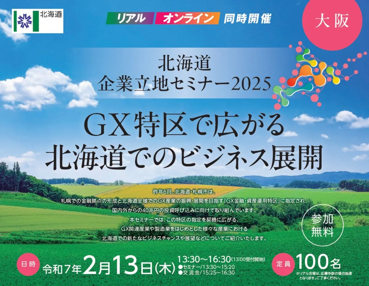 2025年2月13日、大阪のインターコンチネンタルホテルで、北海道企業立地セミナーが開催されます。このセミナーは、昨年6月に「GX金融・資産運用特区」として指定された札幌市を中心に、北海道のGX関連産業や製造業に焦点を当てています。北海道では、国内外からの投資を呼び込み、最大40兆円を目指す取り組みが行われており、その一環として本セミナーが企画されました。