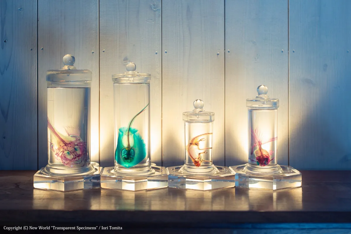 「透明標本」とは、独自の技術により生物の内部構造を美しく見せる作品。これを制作しているのが作家の冨田伊織です。彼は北里大学水産学部在学中に研究用の透明標本に感銘を受け、2008年から作家活動を開始しました。今回の展覧会では、冨田氏の卓越した技術を直接体感できる貴重な機会が用意されています。