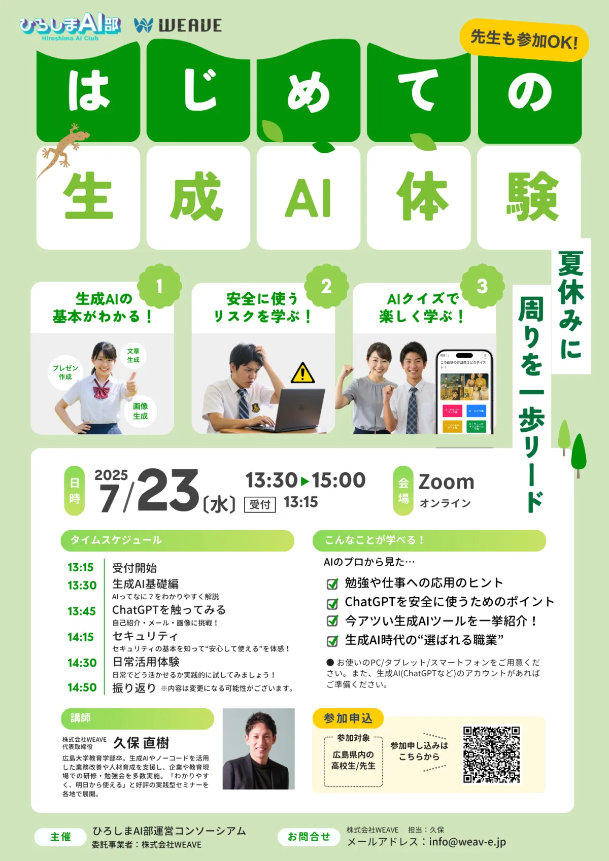 2025年7月23日、広島県内で「はじめての生成AI体験イベント」がオンラインで行われ、約30名の高校生と教員が参加しました。このイベントは、株式会社WEAVEと広島県の「ひろしまAI部」が協力して実施したもので、生成AIの基礎知識とその活用方法を学ぶことを目的としています。