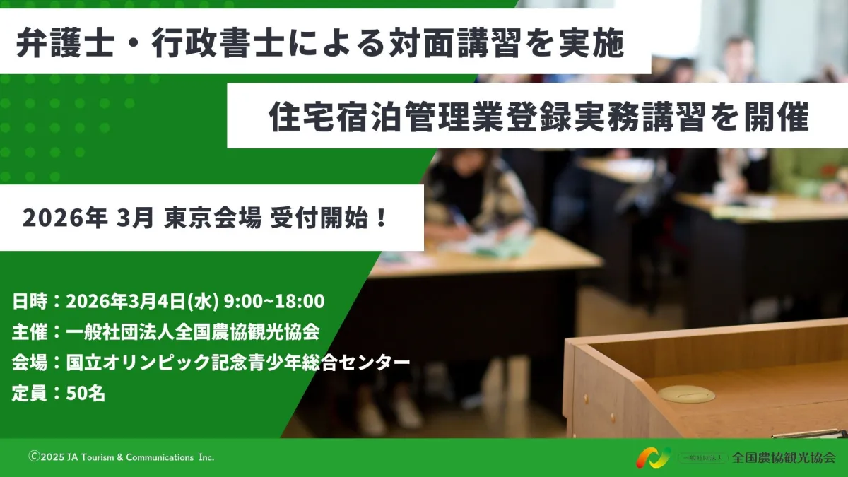 一般社団法人全国農協観光協会が主催する「住宅宿泊管理業登録実務講習」が、2026年3月4日(水)に東京・渋谷にある国立オリンピック記念青少年総合センターで開催されることが決まりました。すでに約900名がこの講習を修了しており、好評につき追加日程が設定されたのです。この講習は、国土交通大臣に登録された第1号の実務講習機関として認定されています。