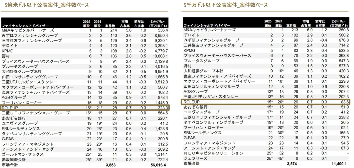 株式会社ROLEUPは、今年発表されたM&Aリーグテーブル「中規模市場 日本M&Aレビュー2025年(1‐12期)」において、5億米ドル以下の公表案件数で16位、5千万ドル以下の公表案件数で15位にランキングされました。この成績は、前年に比べて大幅な飛躍を遂げたことを示しています。特に、5億米ドル以下の案件は前年の21位からの上昇であり、5千万ドル以下の案件も20位からのランクアップです。これらの数字は、株式会社ROLEUPが市場での位置を強化し、信頼性の高いファイナンシャルアドバイザーとしての地位を確立するための重要な指標となっています。