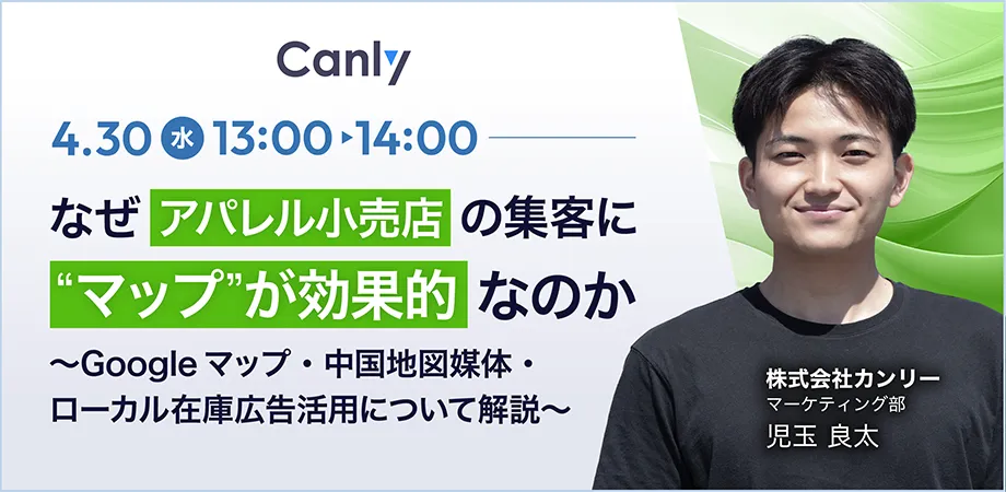 株式会社カンリーでは、2025年4月30日(水)13時から無料セミナー「なぜアパレル小売店の集客に“マップ“が効果的なのか」をオンラインで開催します。このセミナーでは、GoogleマップやYahoo!プレイス、Appleマップなどの3大地図メディアと、ローカル在庫広告の活用法について詳しく解説します。