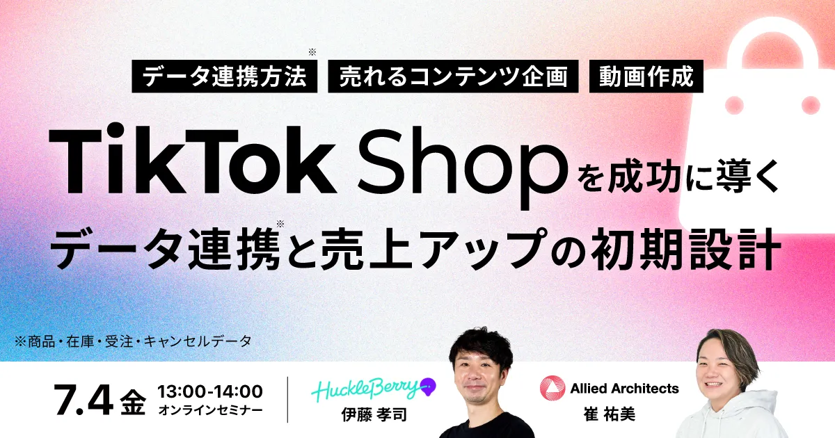 アライドアーキテクツ株式会社は、株式会社ハックルベリーと共催で、TikTok Shopを成功に導くための無料オンラインセミナーを7月4日に実施します。このセミナーでは、ECカートやモールとのデータ連携や、売れるコンテンツの企画方法について、実践的な事例を交えながら詳しく解説します。