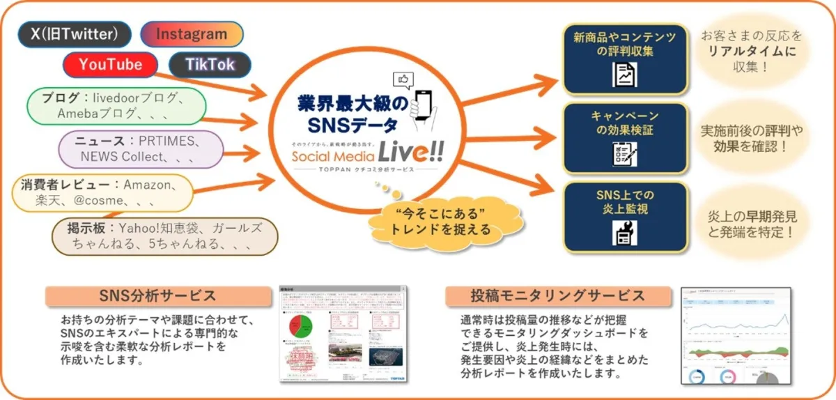 最近、SNSは特に若年層を中心に急速に広まり、様々な商品やサービスに関するクチコミが頻繁に投稿されています。こうしたSNSの多様化は、企業にとってマーケティング戦略を見直すための新たな機会でもありますが、一方で、炎上などのリスクも伴っているため、適切な監視と分析が求められています。TOPPANは、生成AIの活用による新たな分析手法を取り入れ、SNSのクチコミを総合的に捉えるサービスを展開します。