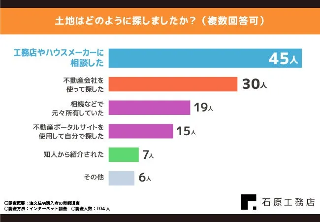注文住宅を考える上で、最初のステップとなるのが土地探しです。本調査では、回答者の45%が「工務店やハウスメーカーに相談して土地を探した」と答え、これが最も多い回答となりました。次いで30%が「不動産会社を利用」との結果が続きました。これは、専門家の助言を重視する現代のトレンドを反映しています。