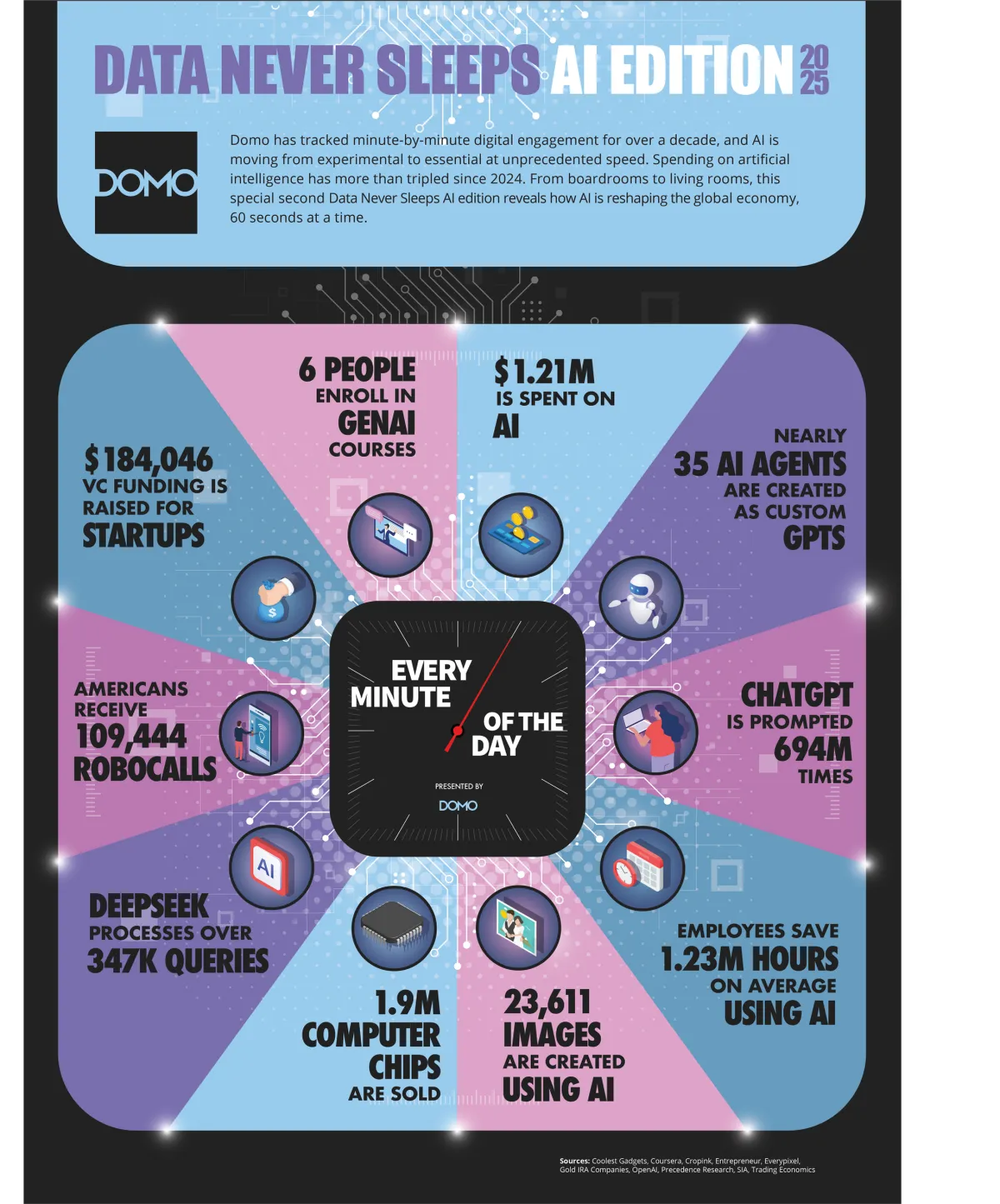 米国ユタ州シリコンスロープスに本社を構えるDomoが、年次分析レポート「Data Never Sleeps(AI版)」第2弾を発表しました。このレポートは、過去1年間のAIの成長とともに、インターネット上で鳴り響く毎分のAIデータの実態を明らかにし、AIが私たちの日常生活に与える影響を詳しく探求しています。
