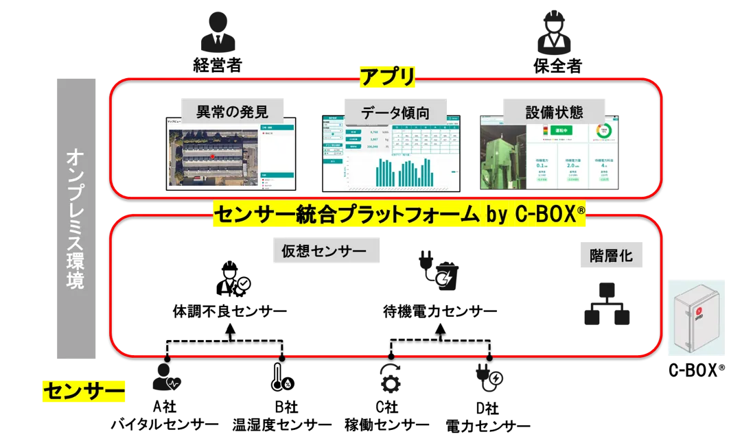 このセンサー統合プラットフォームは、異なる出力や通信方式を持つ複数のセンサーを簡単に統合することが可能です。例えば、設備単位で管理されるセンサーを「C-BOX®」という制御装置を介して集約します。これにより、設備の状態や作業者の動作がリアルタイムでモニタリングできるため、現場の状況を的確に把握することが可能です。
