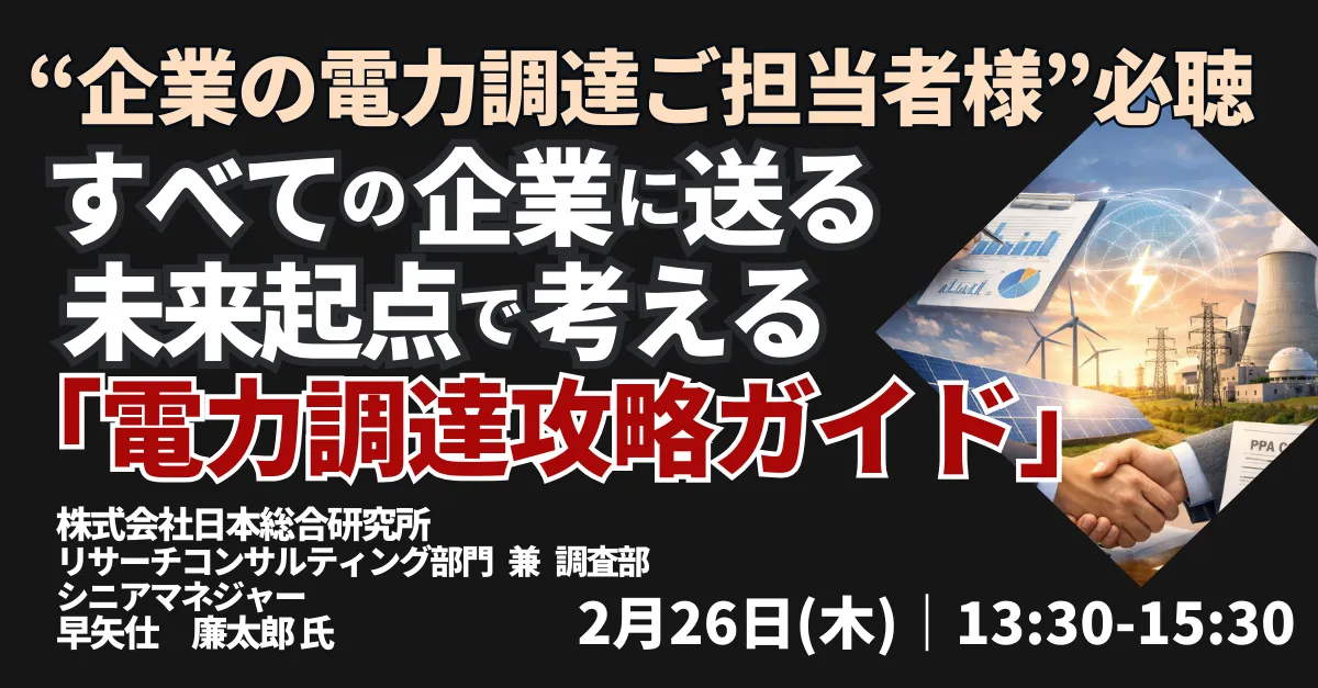 日本計画研究所(JPI)は、2026年2月26日に「未来起点で考える 電力調達攻略ガイド」セミナーを開催します。本セミナーの講師は、株式会社日本総合研究所のシニアマネジャー、早矢仕廉太郎氏です。今回は、企業における電力調達の新たなアプローチについて学ぶ貴重な機会となります。