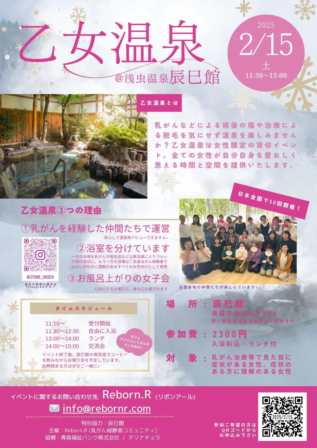 2025年2月15日、青森市の浅虫温泉の旅館「辰巳館」にて、乳がん経験者を対象とした入浴イベント『乙女温泉』が開催される運びとなりました。本イベントは、青森福祉バンク株式会社が主催し、兵庫県を拠点とする団体Reborn.Rと共催で行われます。