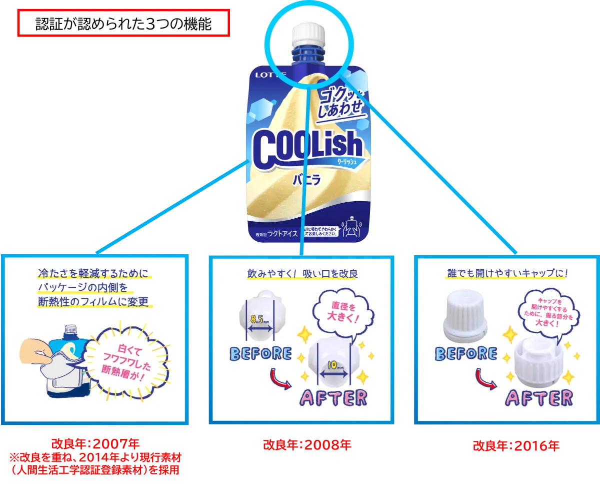 「クーリッシュ」の包装設計を担当する加藤宏冶さんと池田祐一さんは、以下のようにコメントしています。「『クーリッシュ』は、独特な『口栓付きパウチアイス』の形状を持ち、どこでも手軽に楽しめるという特有の価値があります。2003年に誕生して以来、私たちは使用感を向上させるために、何度も容器の改良を行ってきました。今回の認証取得を通じて、この独自の魅力をさらに広く知らしめていきたいと考えています。」