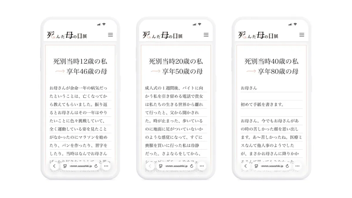 「死んだ母の日展」は、ただの展示ではなく、様々な思いを抱えた人々が共感できる場所です。参加者は匿名で手紙を投稿し、自身の経験に重ね合わせた他者の声を読むことができます。これは、死別による孤独感の解消や、感情を分かち合うための新たな試みとされています。手紙の「表紙」には亡くなったお母さんの享年と、その時の参加者自身の年齢が記され、自らの感情に共鳴する内容を探しやすい工夫が施されています。