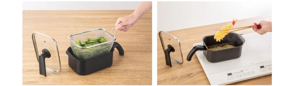 このマルチポットは、1台で煮る、炒める、揚げる、和える、炊く、茹でる、沸かすの7つの用途に対応します。角型になったことで使いやすさが向上し、自立するふたや脚付きのストレーナーを採用しています。これにより、調理中のスペース確保も楽になります。