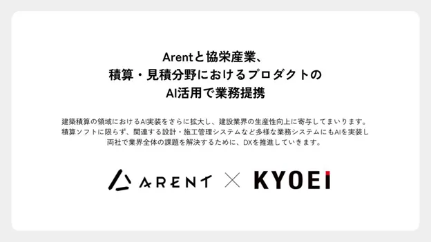 建設業界が直面する労働力不足や効率化の課題に対応するため、協栄産業株式会社と株式会社Arentが業務提携を結びました。この提携の主な目的は、建築積算・見積分野においてAI技術を活用することによって、業務の効率化を図ることです。