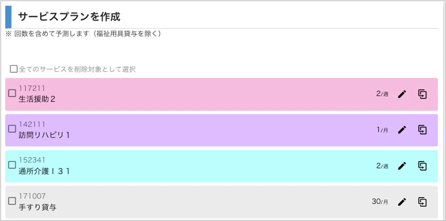 この機能では、あらかじめ設定したサービスプランに基づいて、自動的に週間サービス計画表が作成されます。手間のかかる転記や再入力が不要となり、業務の効率が大幅に向上。PDF形式での出力も可能で、現場での修正や確認もスムーズに行えます。