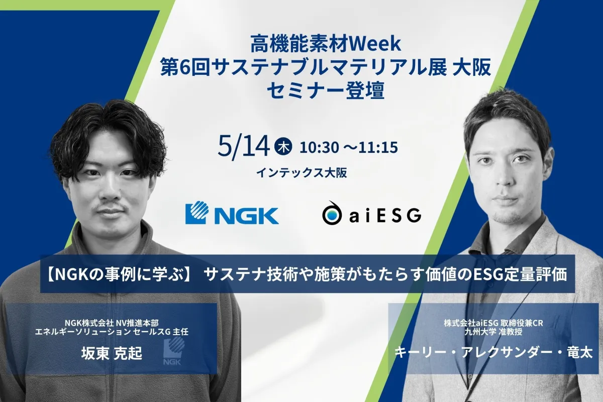 株式会社aiESG(アイエスジー)は、2026年5月14日(木)に開催される「第6回サステナブルマテリアル展」にて、NGK株式会社をゲストとして迎え、特別セミナーを実施します。このセミナーのテーマは「【NGKの事例に学ぶ】 サステナ技術や施策がもたらす価値のESG定量評価」です。場所はインテックス大阪で、時間は10:30から11:15までとなっています。