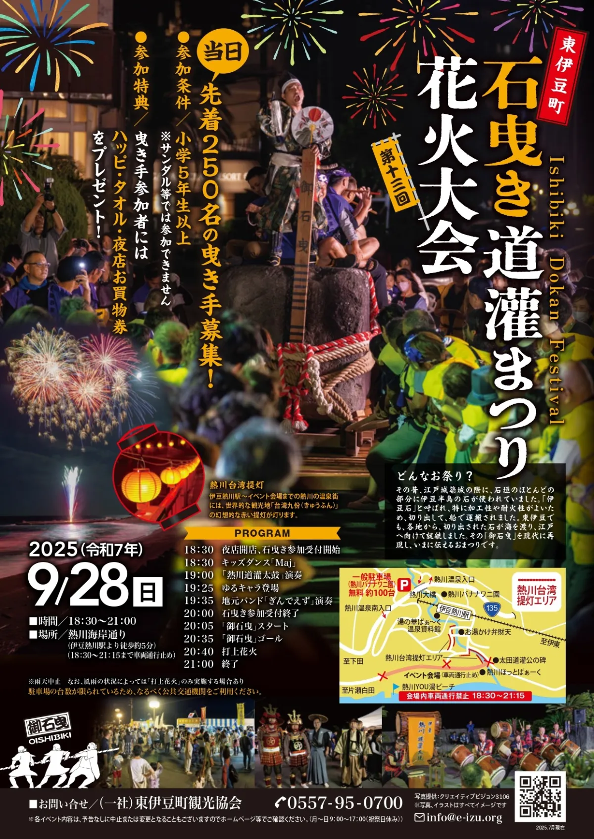9月28日、静岡県熱川温泉で開催される「第13回石曳き道灌まつり花火大会」は、ただの花火大会とは一線を画す特別な体験が待っています。このイベントは、江戸時代の石曳きを実際に体験し、その後に迫力満点の花火を楽しむことができる、全国的にも珍しい体験型イベントです。