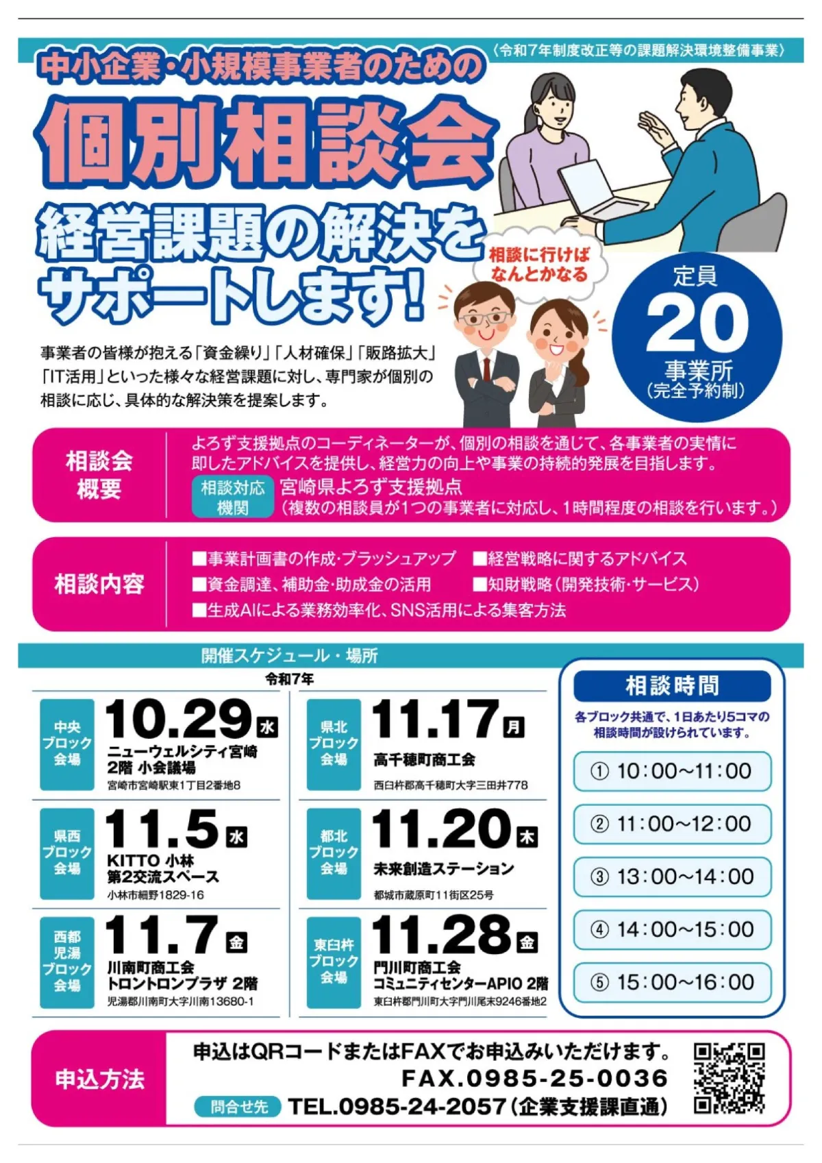 この相談会では、中小企業が抱える「資金繰り」「人材確保」「販路拡大」「IT活用」など、多岐にわたる経営課題に対して、具体的な解決策が提案されます。宮崎県よろず支援拠点と連携し、各地域のコーディネーターが個別にアプローチを行います。現地会場での対面相談に加え、オンラインでも相談が可能なため、参加しやすい環境が整っています。