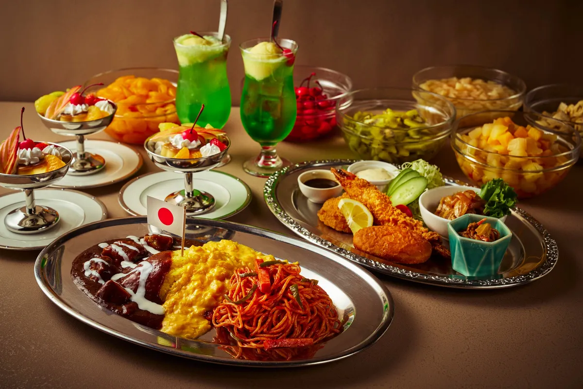 会場は「メインダイニング錦」と呼ばれるシアターレストランです。豪華でレトロ感あふれる内装の中、昭和の懐かしいメニューが登場。例えば、今を生きる私たちにも親しみ深いナポリタンやオムライスといったお子様ランチ風メインディッシュ、さらには豚の生姜焼きやエビフライといった昭和を代表する定番メニューも揃います。
