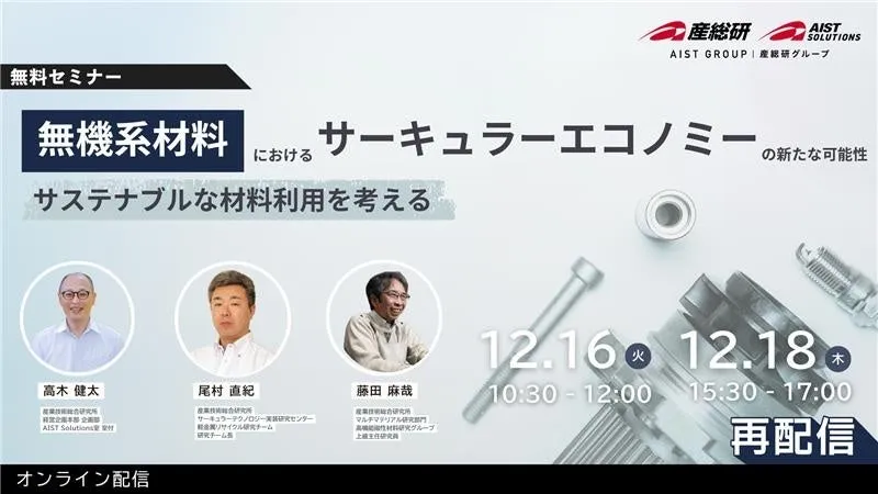 2025年の12月16日と18日、オンライン配信による無機系材料に関する無料のセミナーが予定されています。このセミナーでは、サーキュラーエコノミーの概念を基に、特にアルミニウム、モータ、熱の三つの領域に焦点を当て、新たな技術や知見を共有します。