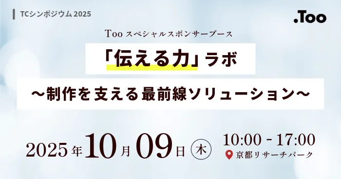 クリエイティブ業界の総合商社、株式会社Tooが特別スポンサーとして参加する「TCシンポジウム2025」は、情報伝達技術を中心に開催されます。2025年10月9日(木)、京都リサーチパークにて「伝える力を支える仕組み」をテーマにした特別セミナーやブース展示が行われます。