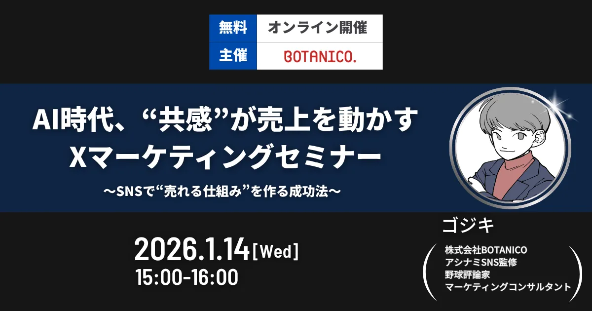 2026年1月14日、株式会社BOTANICOが主催した「AI時代、“共感”が売上を動かすXマーケティングセミナー」は、オンラインで開催され、参加者から高い評価を得ました。本セミナーでは、SNSマーケティングの新たな潮流として、“共感資産”の重要性が強調されました。