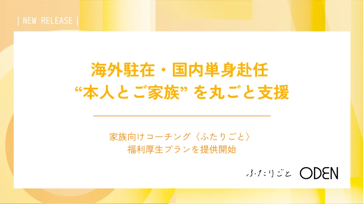 株式会社Odenは、オープンな対話を重視し、家族向けの専門コーチングサービス「ふたりごと」を企業の福利厚生として提案する新プランを来たる2025年7月より開始すると発表しました。このプランは特に海外駐在者や国内単身赴任者と、そのご家族に向けたもので、心の負担や孤独感を和らげることを目的としています。