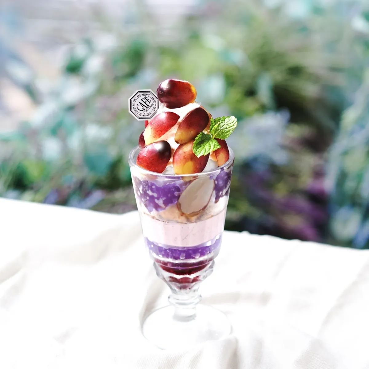 パフェの中には、ラベンダーが香るゼリーや、なめらかなホイップクリーム、バニラアイスクリームが重なり、グレープムース、アーモンドクランブル、さらには甘酸っぱいベリーソースがふんだんに使われています。これにより、見た目も華やかで、美しい層が楽しめます。一口食べるだけで、果実の甘みとラベンダーの香りが広がり、贅沢なひとときを演出します。