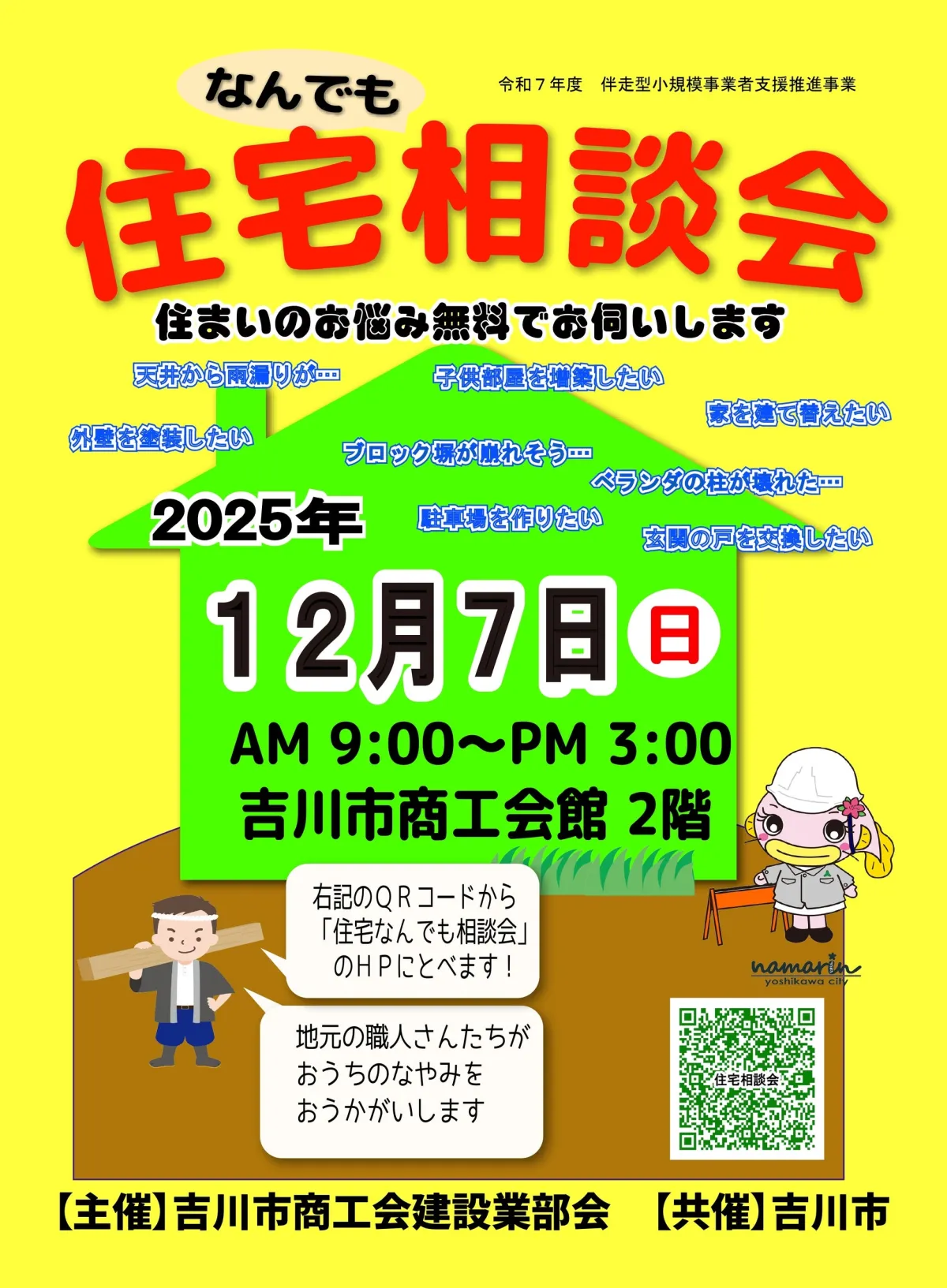「住宅なんでも相談会」は、吉川市商工会建設業部会内の吉川市建築協力会が主催しています。この会は、地域に密着し、住民の住まいに関わるさまざまなお悩みに対応することを目的としており、毎年4回(4月、9月、11月、12月)開催されています。日本各地でよく見られるこの形式の相談会は、市民にとっても安心して住まいの問題を相談できる貴重な場となっており、これまでに多くの方々が利用してきました。