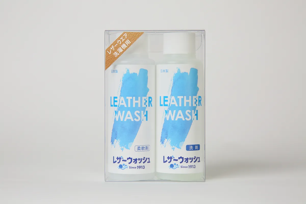 「レザーウォッシュ」には、革小物丸洗い用とレザーウェア洗濯機用の2種類があり、それぞれの用途に応じた特長を備えている。まず、靴や財布、バッグなどの革小物を手洗いでやさしく洗浄できる「靴・革小物丸洗い用」。この製品は、汚れを落とすだけでなく、革に油分と保湿成分を加えることで、日常的なメンテナンスをサポートすることができる。