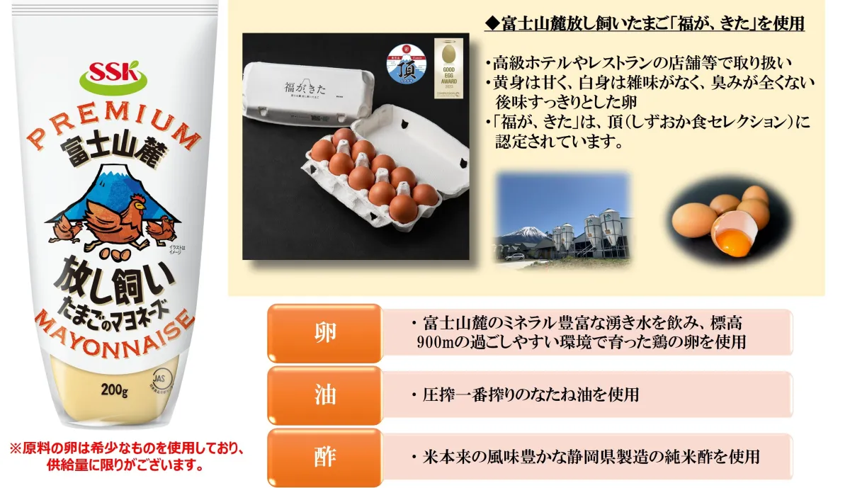 静岡市葵区に本社を持つエスエスケイフーズ株式会社は、長年愛されてきた「SSKマヨネーズ」に新たなるアイテム「SSK 富士山麓放し飼いたまごのマヨネーズ」を追加することを発表しました。このマヨネーズは、富士山麓の特別な環境で育った鶏が産んだ放し飼いたまごを使用しているため、その風味はまさに格別です。