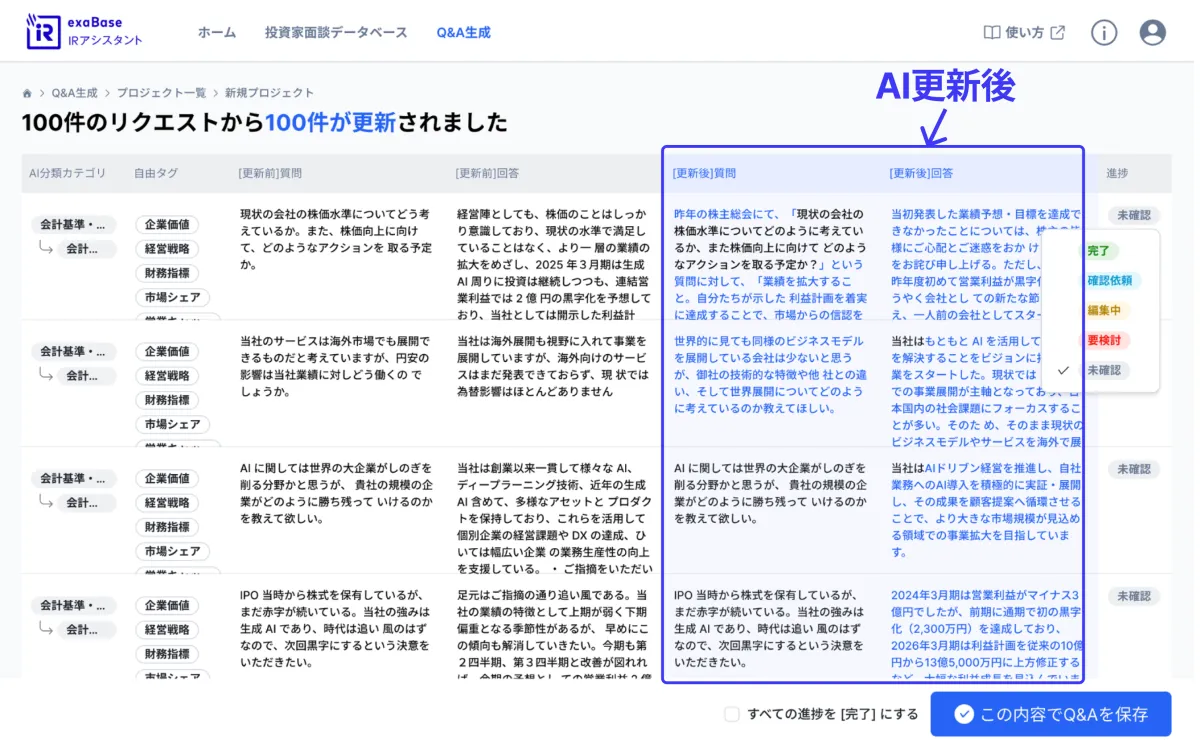 - - ボタン一つで更新・編集:取り込んだQ&Aは、最新の決算報告書や資料をもとにボタン一つで更新・編集できるため、手間を大幅に削減します。
