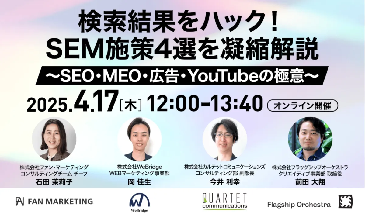 2025年4月17日、サーチエンジンマーケティング(SEM)をテーマにしたウェビナーが開催されます。このセミナーでは、特に検索エンジンからの集客の重要性に焦点を当て、実践的な知識を提供します。