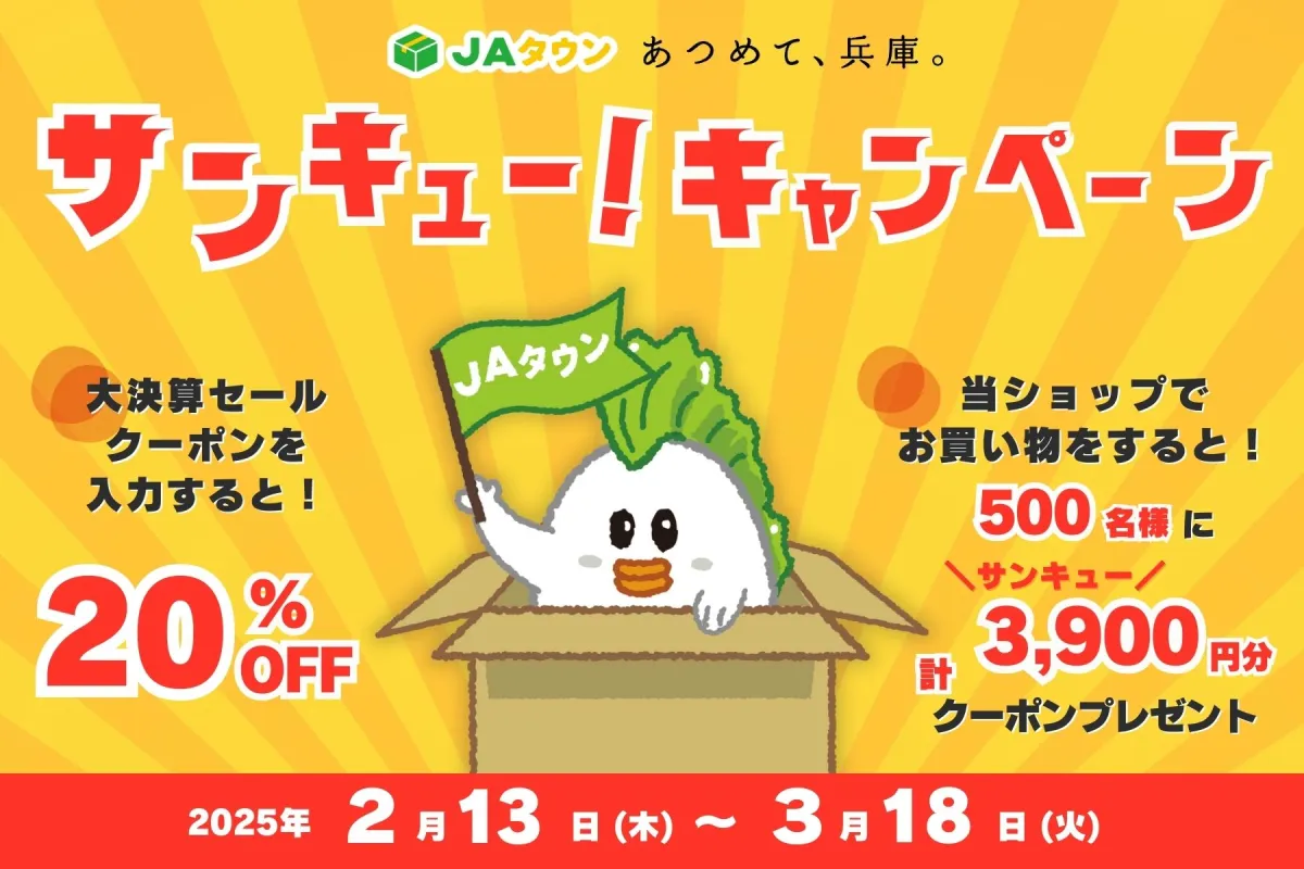 2025年2月から3月にかけて、JA全農兵庫が運営する産地直送通販サイト「JAタウン」のショップ「あつめて、兵庫。」において、「サンキュー!キャンペーン」が開催されます。このキャンペーンは日頃のご愛顧に感謝の意を込めて実施されるもので、期間中は対象商品が20%オフとなる特別なサービスを提供します。