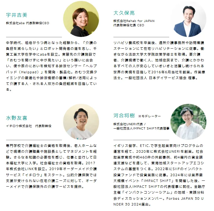 - - 14:00-14:50: パネルディスカッション②「介護領域の社会起業家で見る、社会性と経済性の両立する事業の立ち上げ方」