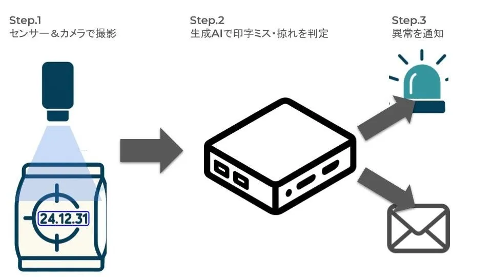 従来の画像解析ソリューションでは、学習コストや投資が巨額にのぼるため、手軽に導入できる代替手段が求められていました。この新たな「印字検査ソリューション」は、距離計センサーとGoogle AI Studioを活用し、自動で異常を検知することでヒューマンエラーやロットの回収リスクを実質0に近づけることが狙いです。